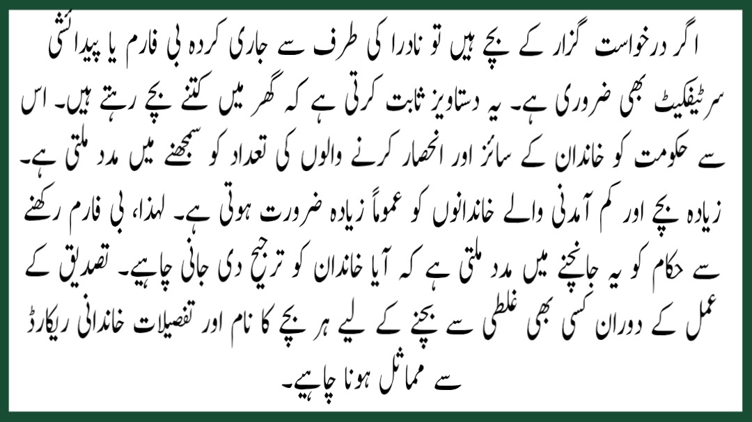 If the applicant has children, then the B-Form or birth certificate issued by NADRA is also required. This document proves how many children live in the household. It helps the government understand the size of the family and the number of dependents. Families with more children and low income are usually in more need. So, having a B-form helps the authorities check if the family should be given priority. Each child’s name and details must match the family record to avoid any mistakes during the verification process.