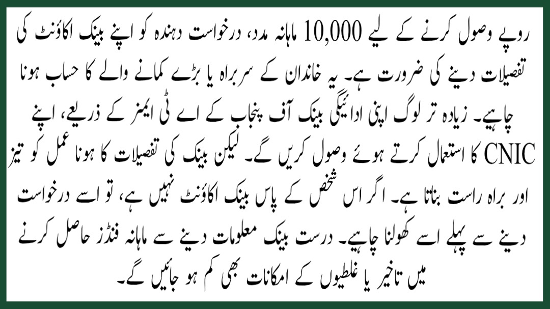 To receive the Rs. 10,000 monthly support, the applicant needs to give their bank account details. This should be the account of head of family or the main earner. Most people will receive their payment through Bank of Punjab ATMs, using their CNIC. But having bank details makes the process faster and more direct. If the person does not have a bank account, they should open one before applying. Giving correct bank information will also reduce chances of delays or errors in getting the monthly funds.