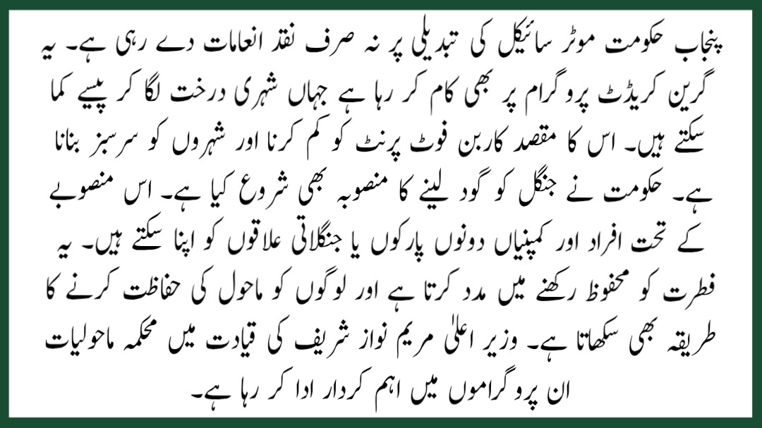 The Punjab government is not only giving cash rewards for bike conversion. It is also working on a Green Credit Program where citizens can earn money by planting trees. The aim is to reduce the carbon footprint and make cities greener. The government has also launched a forest adoption plan. Under this plan, both individuals and companies can adopt parks or forest areas. This helps keep nature safe and also teaches people how to protect the environment. The Environment Department is taking a lead role in these programs, under the leadership of Chief Minister Maryam Nawaz Sharif.